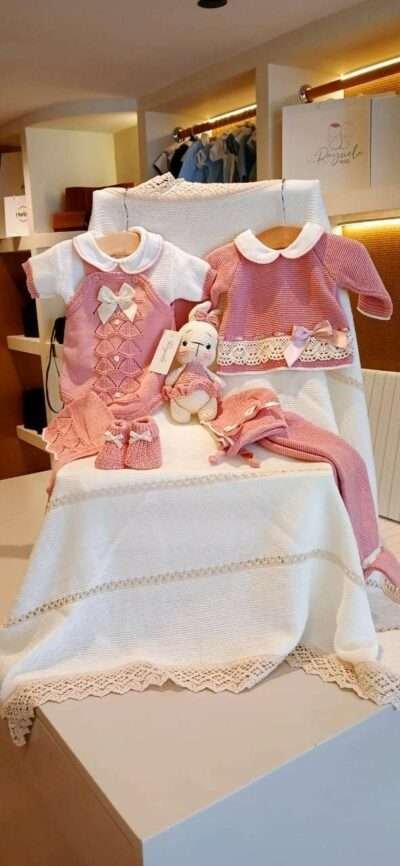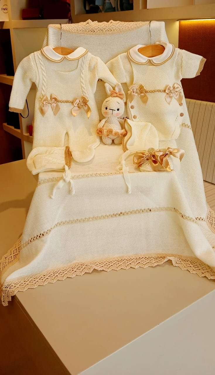 Size:0-3m para bebes 6 a 8.5 libras Incluye: 1 conjunto largo con su gorro de algodón. 100% hipoalergénico (abrigo,rumper,gorro) 1 conjunto corto con su gorro de algodón 100% hipoalergénico (rompee,jersey y gorro) 1 par de zapatos tejidos 1 manta tejida de algodón 100% hipoalergénico con el nombre bordado (según existencia) 1 muñeco tejido hecho en PortugalSet de Recién Nacido Niña: Personaliza tu pedido: