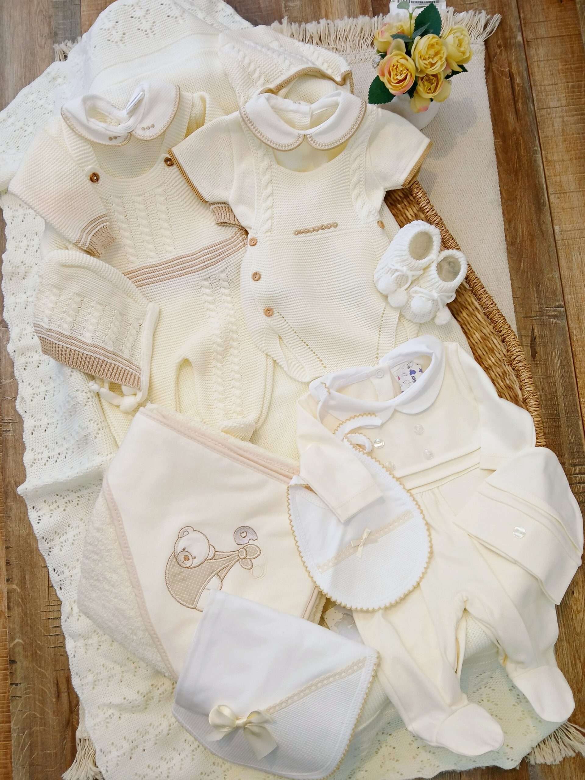 Para la futura mamá... Descubre nuestras cajas de regalo de lujo para un recién llegado. Mima a una nueva mamá con una caja de regalo premium que puede atesorar. Encuentre los elementos esenciales que cualquier nuevo bebé necesitará para darle la bienvenida al mundo. Hermosa caja de regalo para bebe Size:0-3m para bebes 6 a 8.5 libras Incluye: 1 Conjunto largo con su gorro de algodón 100% hipoalergénico (abrigo,rumper,gorro) 1 conjunto corto de 3 piezas con su gorro de algodón 100% hipoalergénico (abrigo, romper y gorro) 1 par de zapatos tejidos 1 Pelele 100% algodón 1 manta tejida de dralon 100% hipoalergénico con el nombre bordado (según existencia) 1 babero cargador con el nombre bordado 1 babero con el nombre bordado 1 toalla de algodón 100% con el nombre del bebe bordado hecho en Portugal Deja el nombre de tu bebé casi al finalizar tu orden en la casilla: dejar nota de su pedido