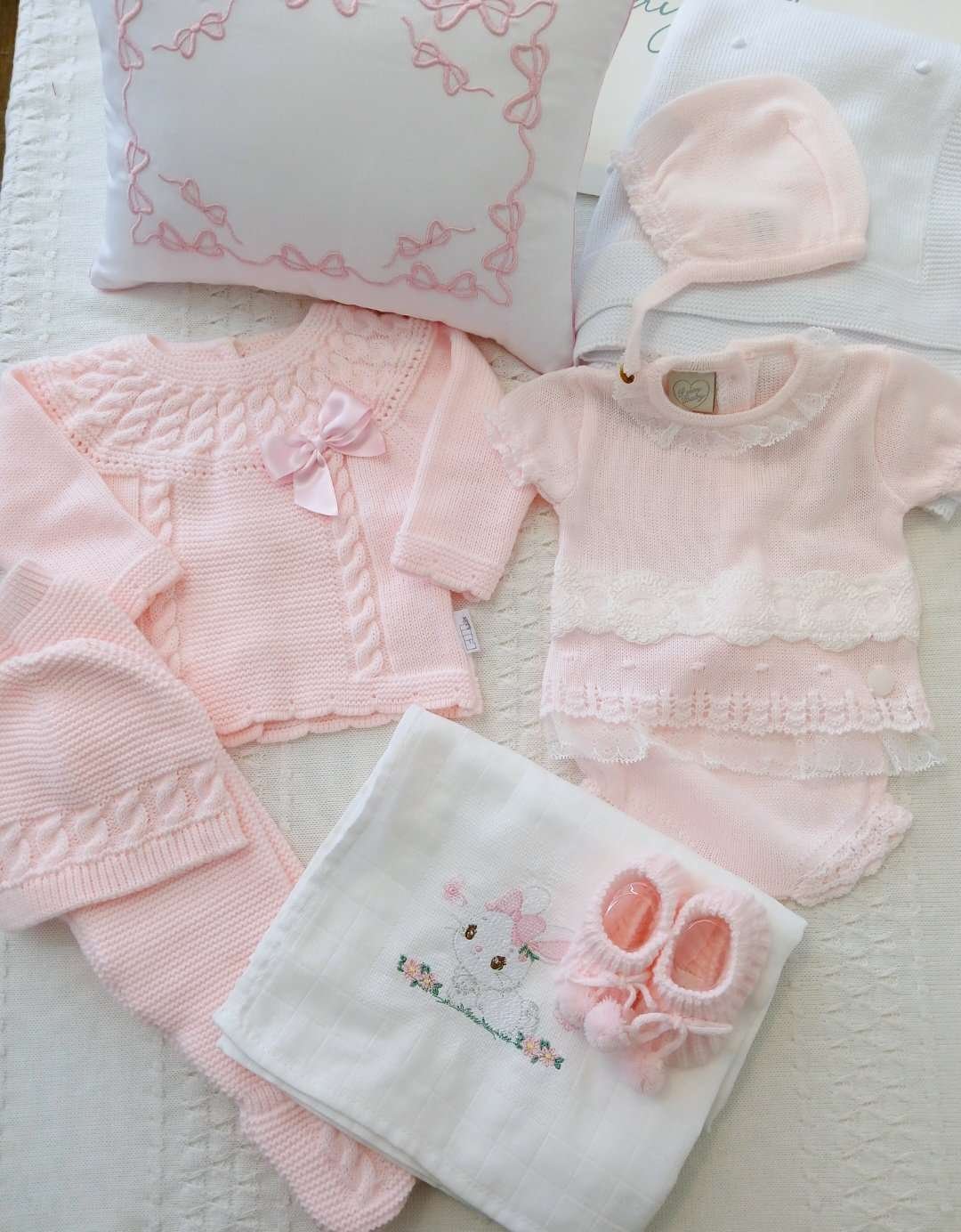 Para la futura mamá... Descubre nuestras cajas de regalo de lujo para un recién llegado. Mima a una nueva mamá con una caja de regalo premium que puede atesorar. Encuentre los elementos esenciales que cualquier nuevo bebé necesitará para darle la bienvenida al mundo. Hermosa caja de regalo para bebe Size:0-3m para bebes 6 a 8.5 libras Incluye: 1 Conjunto largo con su gorro de dralon 100% hipoalergénico (jersey, pantalon y gorro) 1 conjunto corto de dralon 100% hipoalergénico con su gorro (jersey, pantie y gorro) 1 par de zapatos tejidos 1 manta tejida de algodón 100% hipoalergénico con el nombre bordado (según existencia) 1 babero cargador con el nombre bordado 1 almohada personalizada 1 muñeca tejida hecho en Portugal Deja el nombre de tu bebé casi al finalizar tu orden en la casilla: dejar nota de su pedido tiempo de entrega Con personalización: 12 días