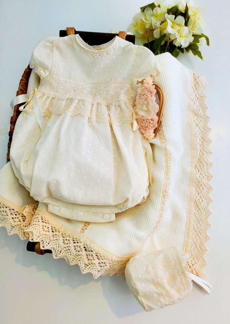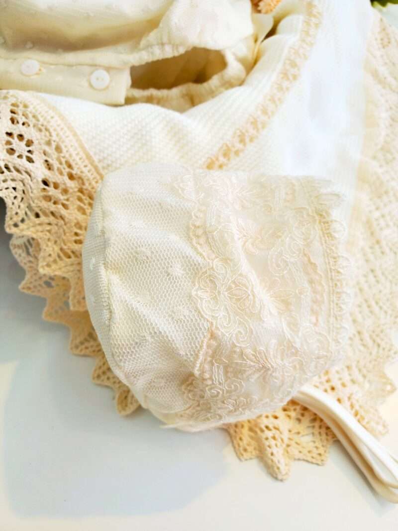 Pelele de bautizo en tull con hermoso encaje y capota a juego