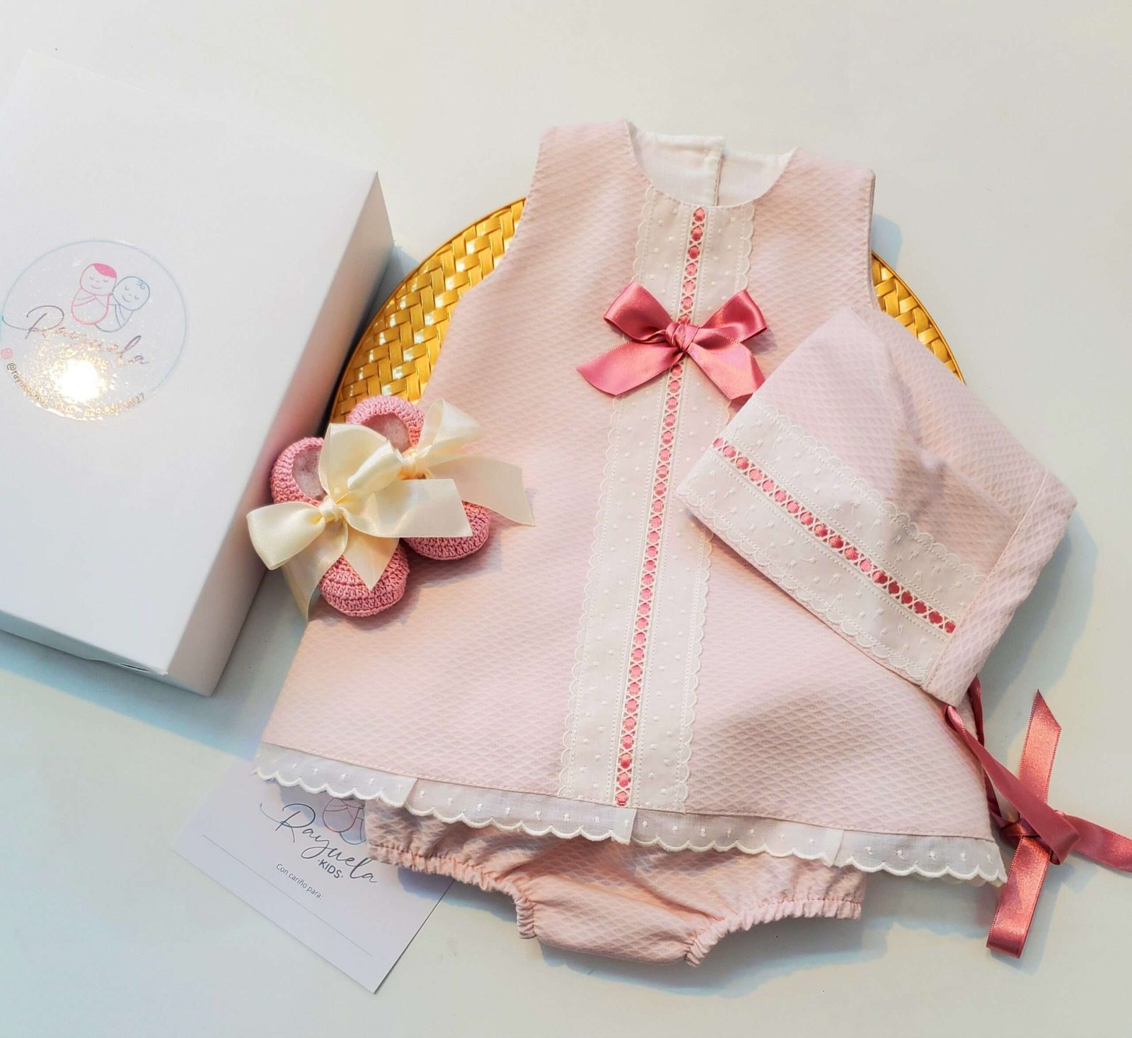 Sorprende a la futura mamá con esta hermosa cajita de regalo. incluye 1 vestido de pique con su cubre pañal y capota talla 0-3m para bebe 6 a 11 libras elaborado en tela de pique español y detalles con puntilla bordada 1 par de zapatos tejidos a mano. hecho en España Lavar a mano.