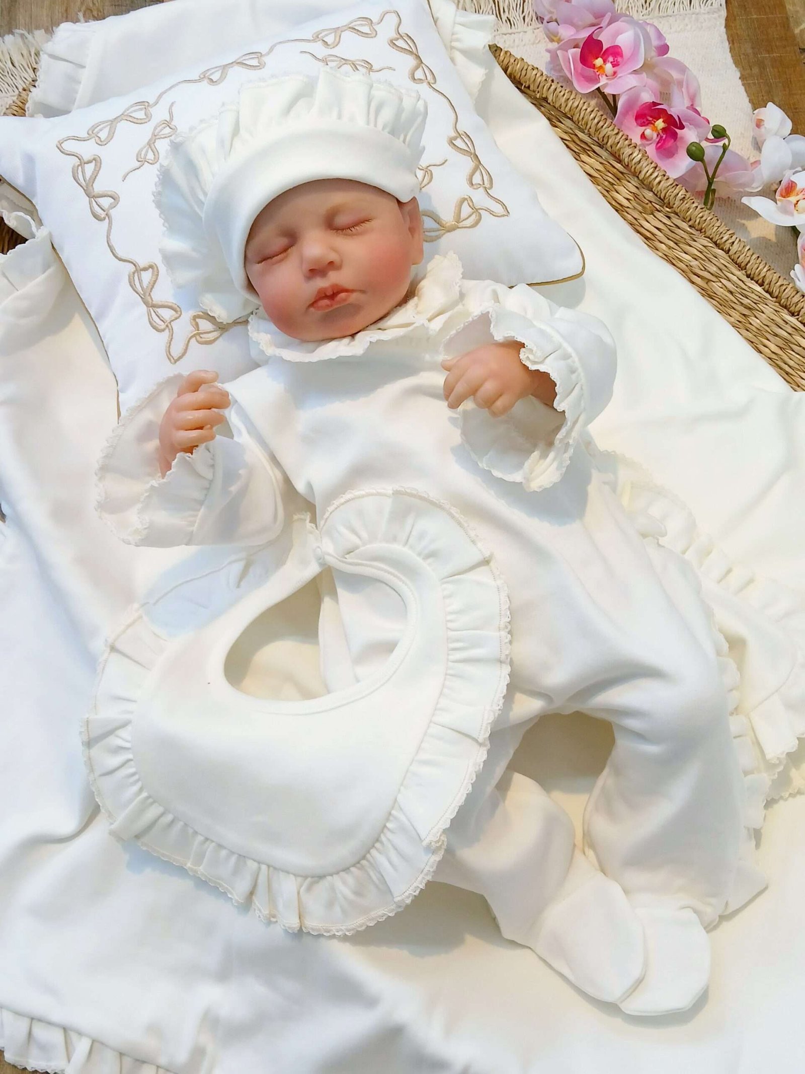 Incluye: 1 Pelele largo con su gorro de algodón. 100% hipoalergénico 1 babero de algodón 100% con el nombre bordado 1 manta 100% algodón con el nombre bordado 1 almohada con el nombre bordado hecho en Portugal Deja el nombre de tu bebé casi al finalizar tu orden en la casilla: dejar nombre del bebé para el bordado