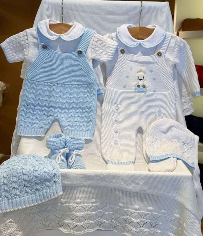 Size:0-3m para bebes 6 a 8.5 libras Incluye: 1 conjunto largo con su gorro de algodón. 100% hipoalergénico (abrigo,rumper,gorro) 1 conjunto corto con su gorro de algodón 100% hipoalergénico (rompee,jersey y gorro) 1 par de zapatos tejidos 1 manta tejida de algodón 100% hipoalergénico con el nombre bordado (según existencia) 1 muñeco tejido hecho en PortugalSet de Recién Nacido Niña: Personaliza tu pedido: